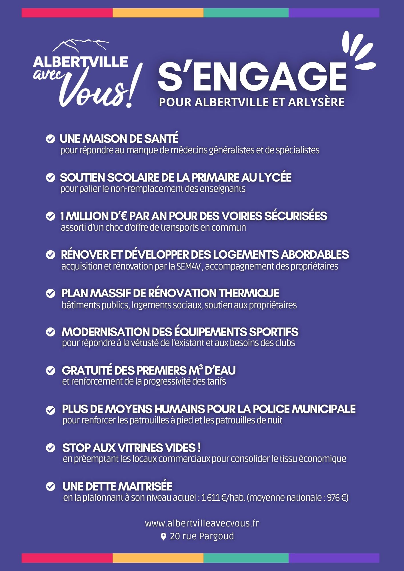 Se loger, se soigner, se déplacer, élever ses enfants, vivre dans une ville sûre et agréable…Apporter des réponses concrètes aux attentes du quotidien, c’est le sens de la candidature Albertville Avec Vous !